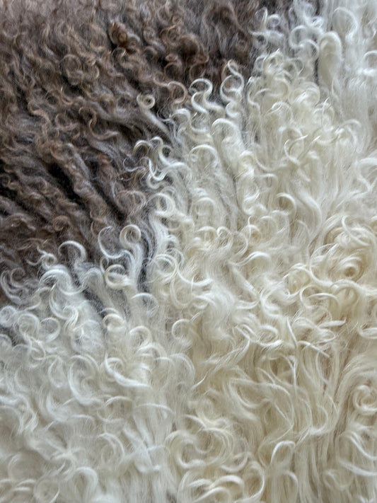 Mönstrat Lammskinn i Vitt & Brunt - LÄngt och VÄgigt Ull (Nr123)