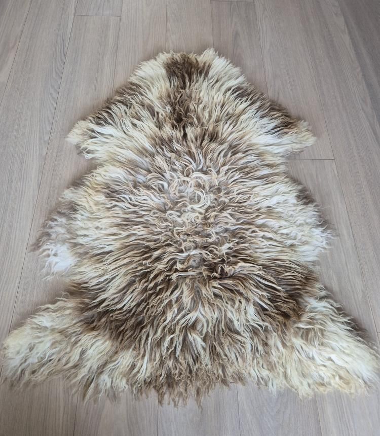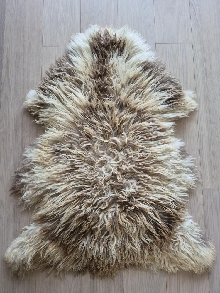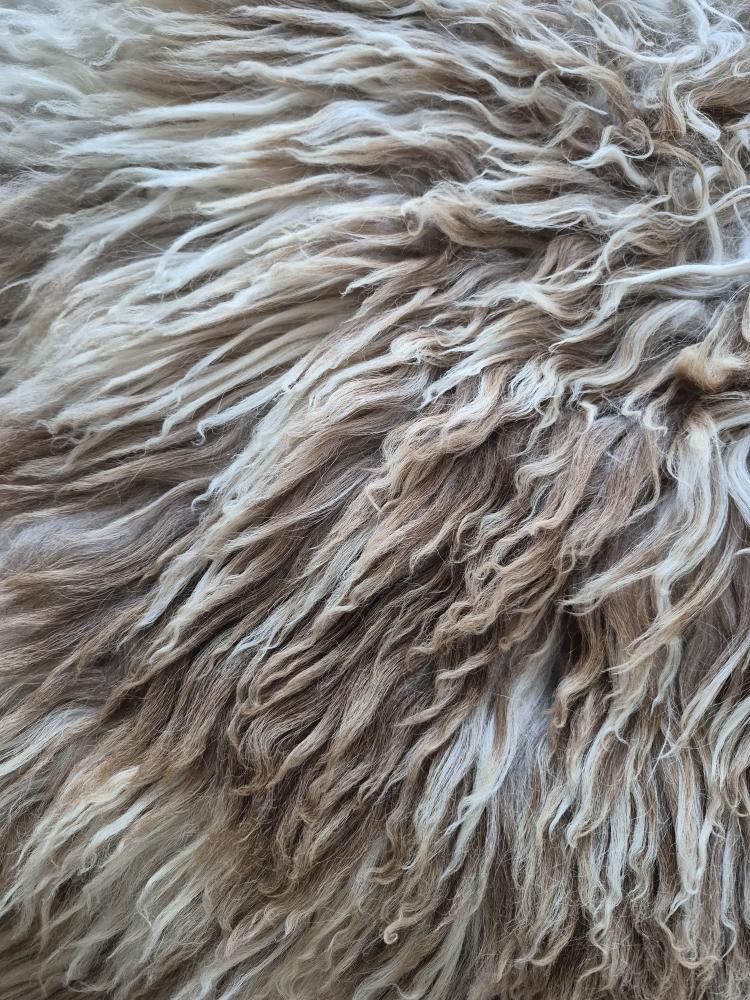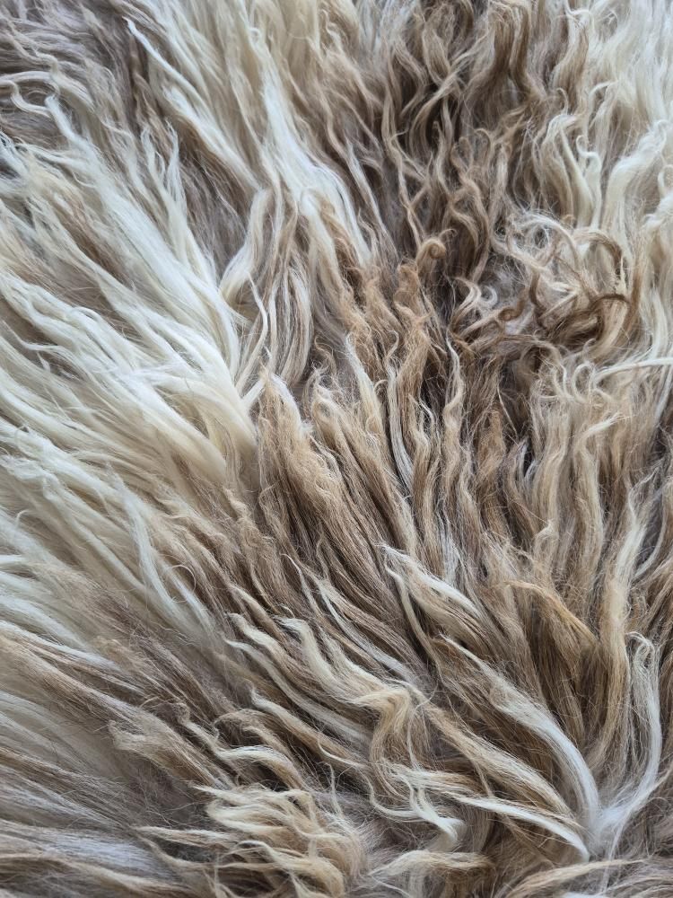 Det hÀr lammskinnet har en naturligt lÄnghÄrig ull med ett mjukt, böljande fall. FÀrgen Àr en varm mix av kremvit, beige och ljusbrun, med lite mörkare partier mot mitten som ger skinnet en levande och rustik karaktÀr.